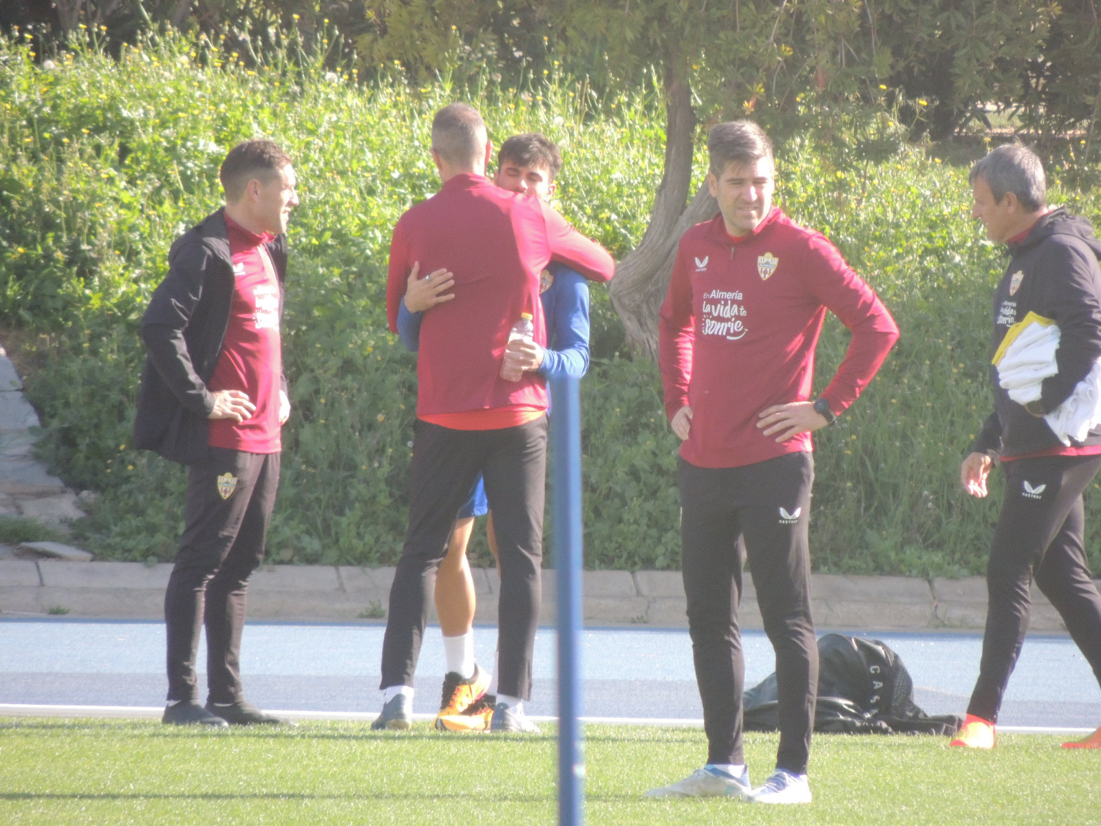 En la foto de nuestro compañero Rafa Góngora, de Radio SER Almería, se puede apreciar el momento en el que Arnau se despedía de su entrenador, Gaizka Garitano, durante su último entrenamiento con el conjunto almeriense.
