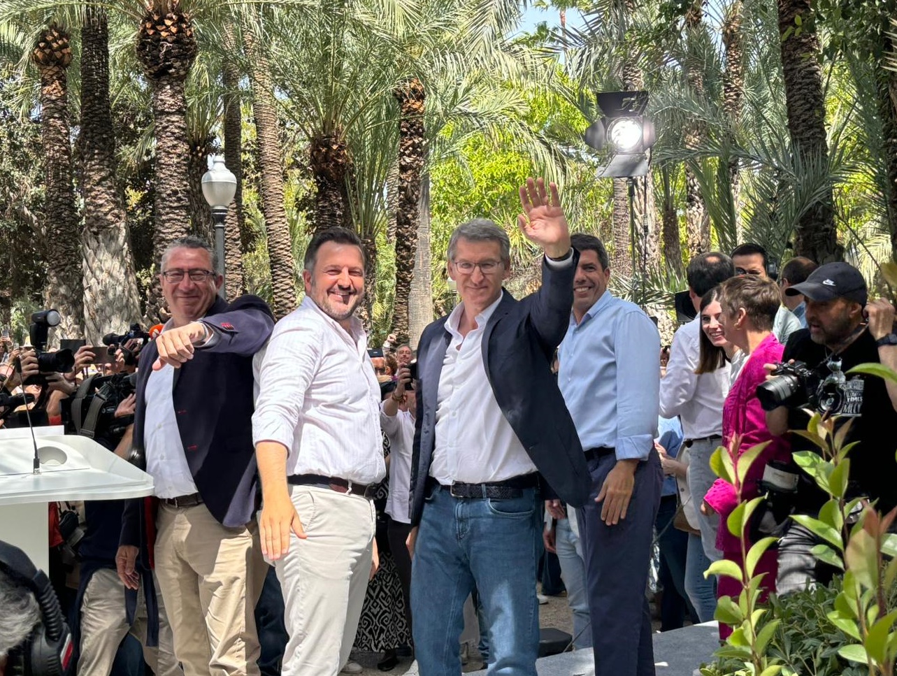 El Parque Municipal ha sido el escenario escogido por el Partido Popular para el acto de campaña a las elecciones europeas, que se celebrarán el próximo 9 de junio, con la presencia del presidente de los populares, Alberto Núñez Feijóo, que previamente ha visitado una empresa de calzado en el Parque Empresarial. Feijóo ha estado arropado por más de un centenar de militantes y representantes de sectores como el calzado, el juguete, la cerámica, el turismo o la agricultura que han sido invitados para exponer sus necesidades. El presidente del Partido Popular ha iniciado su discurso felicitando tanto al alcalde de Elche, Pablo Ruz, como al president de la Generalitat, Carlos Mazón, por ser ejemplo, ha dicho, de como el PP gana.