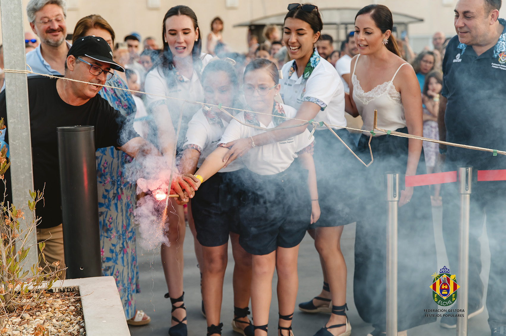 Durante el lanzamiento de la mascletá estuvieron presentes Caridad Martínez, concejal de Mujer, Comercio, Hostelería y Aperturas e Inma Mora, concejal de Festejos y Sanidad. Ambas ediles fueron las encargadas de encender la mascletá junto con Daniel Párraga, gerente del Centro Comercial L’Aljub, Fernando Jaén, presidente de la Gestora de Festejos Populares y las damas mayores e infantiles de Elche. En concreto acudieron la Damas mayores de las fiestas de Elche 2024, Andrea Puentes y Carla Ferrándiz y las Damas infantiles, Adriana Sánchez y Claudia Felipe.
