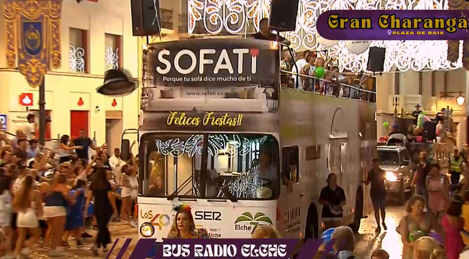 Un año más el Bus de las Fiestas de Radio Elche Cadena SER, Los40 y Elche 7 TV participó en la Gran Charanga con música, animación y repartiendo mil pelotas de goma y muchos caramelos entre todo el público que se agolpó durante el recorrido para ver uno de los desfiles más multitudinarios de Elche. El Bus acompaña además cada día a los asistentes a los Racós y las mascletaes desde el Paseo de la Estación junto al Racó SER Fester. Desde allí se reparten además abanicos y sombreros a los asistentes.