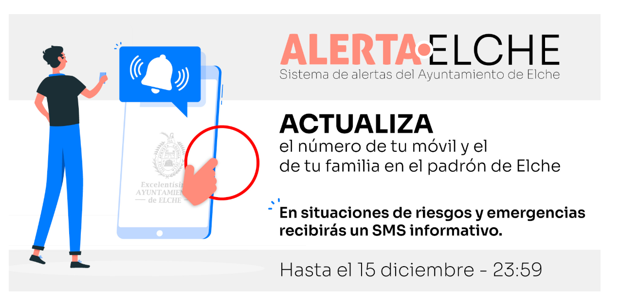 El ayuntamiento de Elche ha puesto en marcha una campaña para que todas las personas empadronadas en Elche desde los 12 años se puedan inscribir en el sistema de alertas con sus teléfonos móviles. Desde hoy y hasta el 15 de diciembre hay de plazo para dejar el número de teléfono. Para ello se puede hacer en cualquier OMAC, mejor con cita previa o a través de la web elche.es.