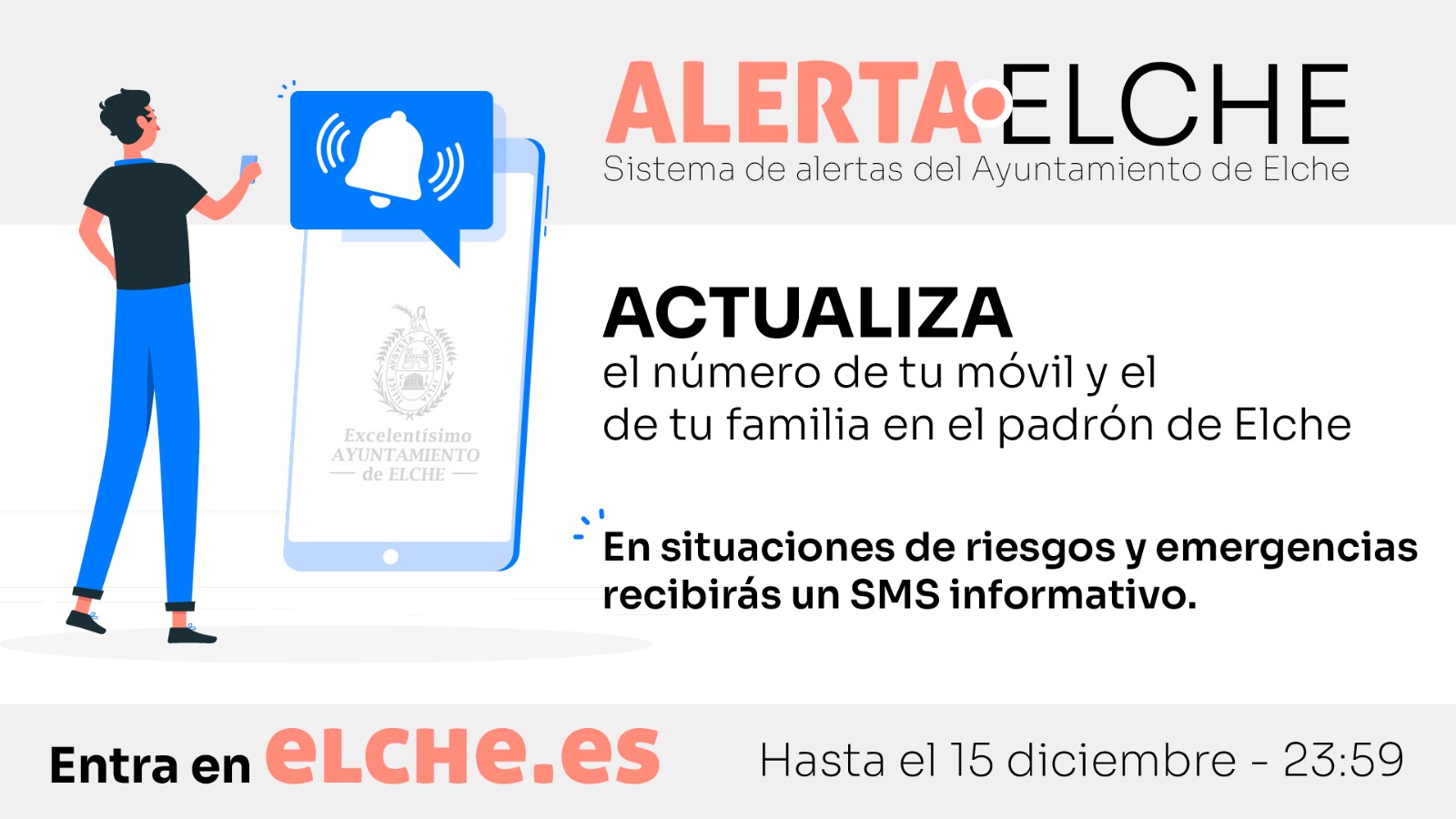 El próximo domingo 15 de diciembre a las 23.59 horas es el plazo que tienen los ilicitanos para actualizar sus teléfonos móviles en el padrón municipal e incorporarse así al sistema de alertas creado por el Ayuntamiento de Elche. Una iniciativa con la que podrán recibir a través de SMS cualquier aviso ante situaciones de riesgo o emergencia. Este mensaje redirige a la web www.elche.es/SOS para ampliar y verificar que los datos son correctos, así como las medidas que deben adoptarse.