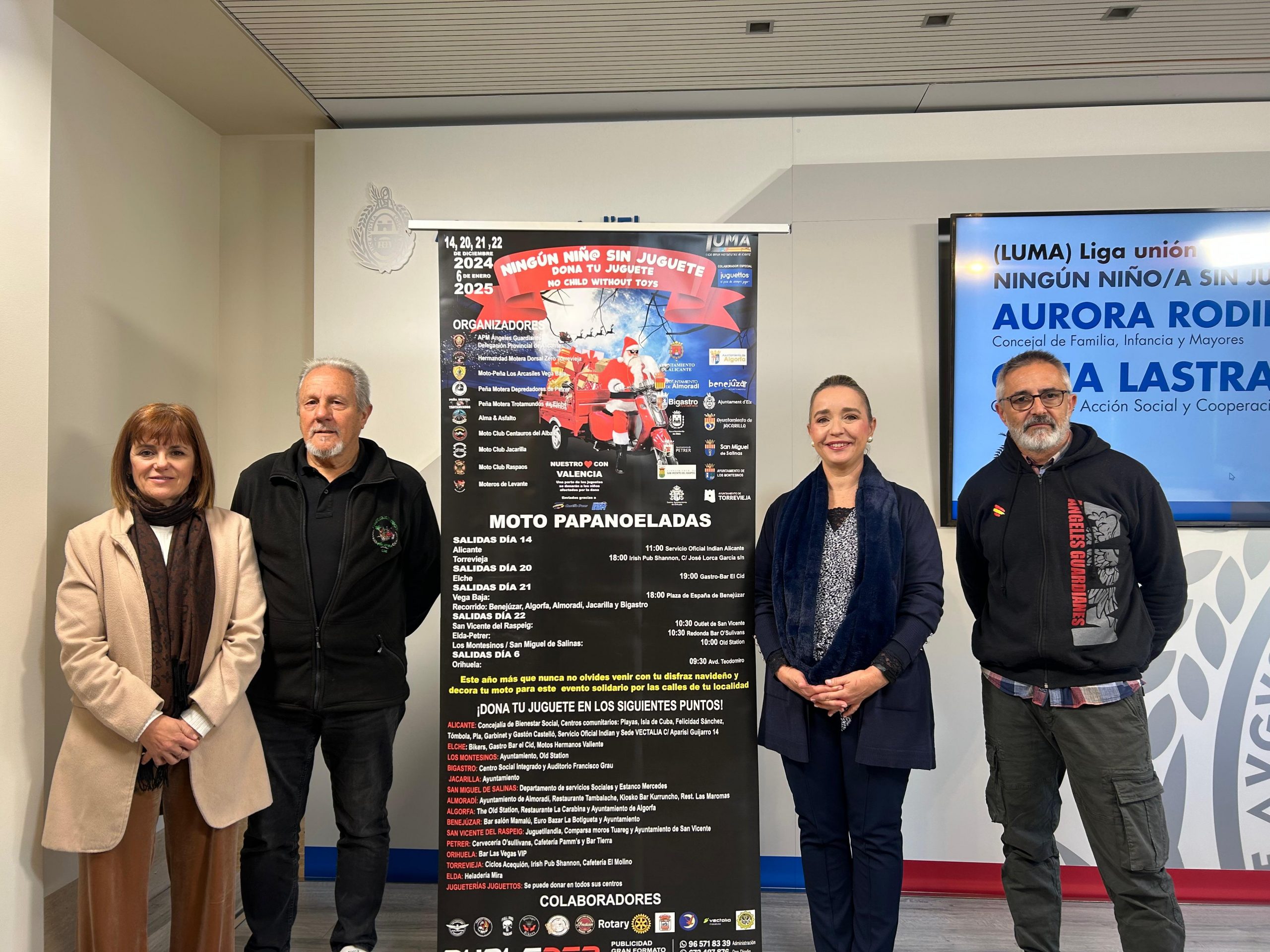La edil de Acción Social, Celia Lastra, ha señalado que “esta campaña nació hace cinco años con la idea de repartir juguetes entre los niños más desfavorecidos mediante rutas en moto vestidos de Papa Noel por varias ciudades de la provincia de Alicante”.