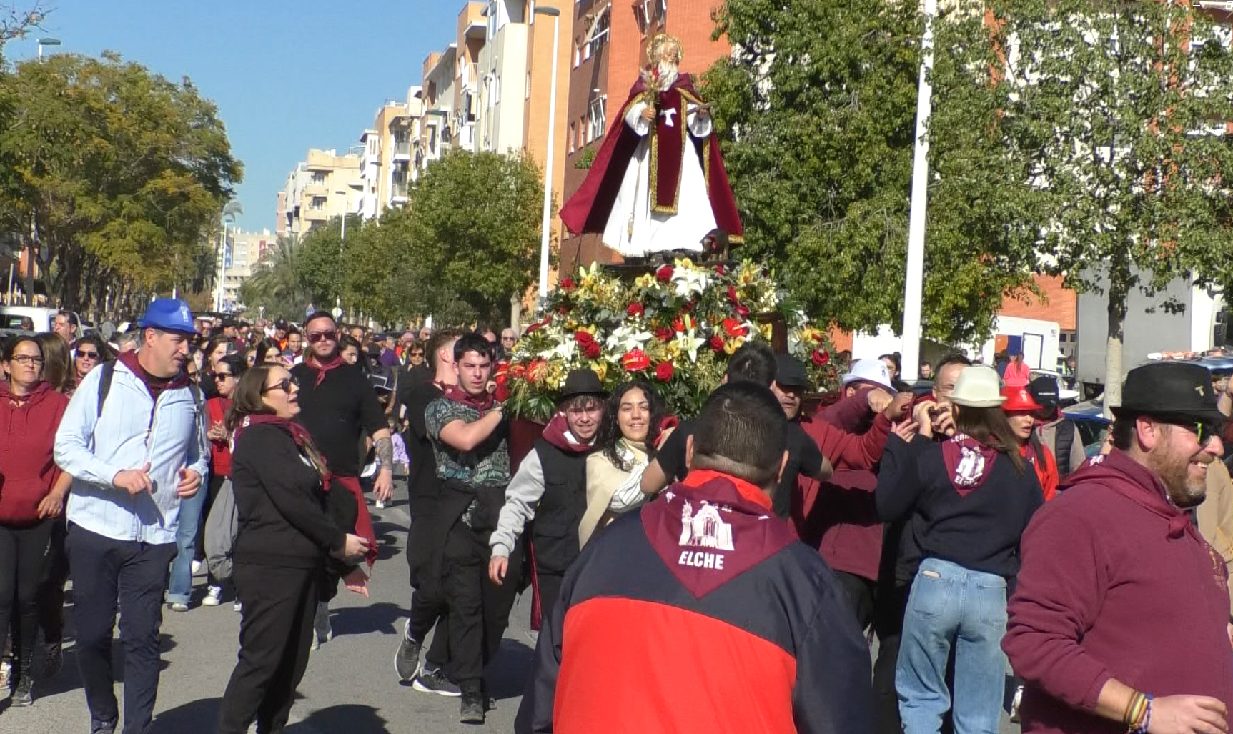 Cientos de personas arroparon ayer a San Antón, patrón de los animales, en su salida en romería desde la parroquia del barrio a la ermita. Salía de su parroquía a las 9:30h en una mañana fría que se fue calentando a medida que iba avanzando la jornada y lucía el sol, algo que propició a que ilicitanos e ilicitanas y visitantes de otros municipios arroparan al santo y disfrutaran de las actividades organizadas en el entorno.