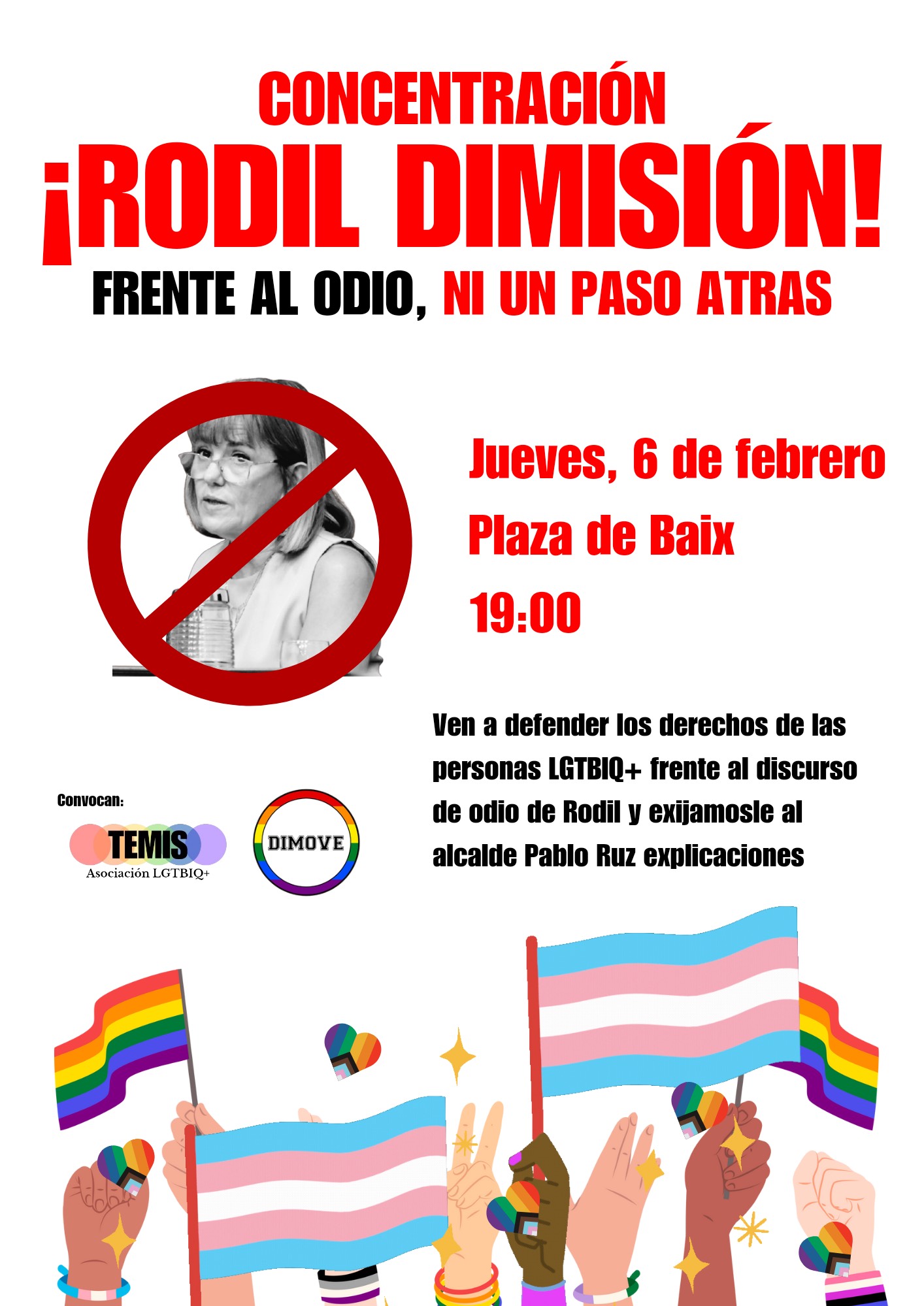 Las asociaciones DIMOVE y TEMIS Elx, convocan a la ciudadanía a concentrarse el próximo jueves 6 de febrero, a las 19:00, en la plaza de baix de Elche para manifestarse en favor de los derechos LGTBIQ+ y exigir la dimisión de Aurora Rodil.
