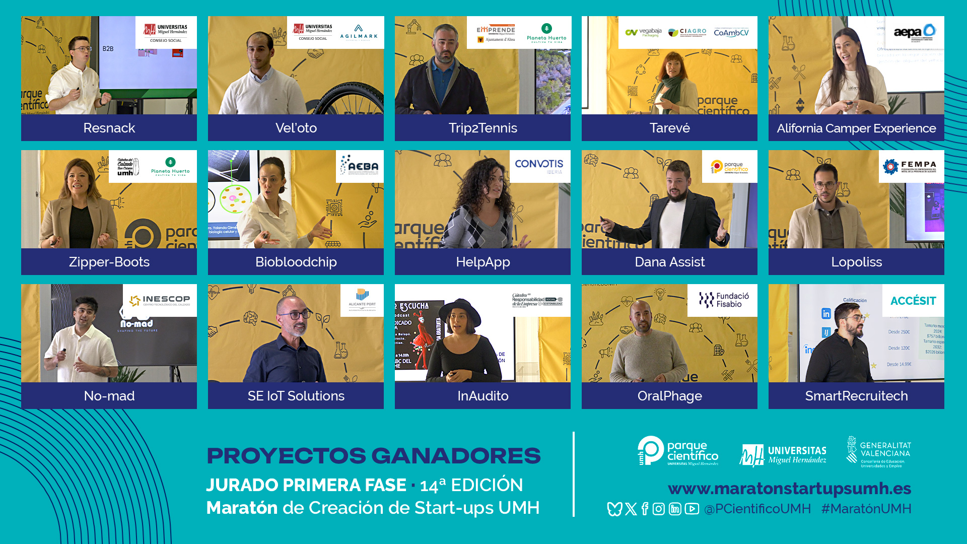 El Parque Científico de la Universidad Miguel Hernández de Elche ha dado a conocer el nombre de los proyectos ganadores de la primera fase de la 14ª Maratón de Creación de Start-ups UMH. Estos han sido Resnack, Vel’oto, Trip2Tennis, Tarevé, Alifornia Camper Experience, Zipper Boots, Biobloodchip, HelpApp, Dana Assist, Lopoliss, No-mad, SE IoT Solutions, InAudito, OralPhage. Todas ellas, se repartirán cerca de 12.000 euros y otros premios especiales. Además, la propuesta SmartRechruitech ha recibido un accésit para pasar a la segunda fase del programa.