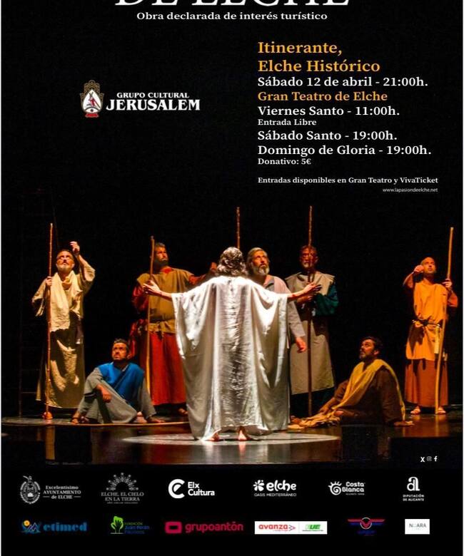 Por otro lado el Grupo Cultural Jerusalem representará la obra en el Gran Teatro el Viernes Santo, 18 de abril, a las 11:00 horas con entrada libre. También, el Sábado Santo, 19 de abril, se representará en el Gran Teatro a las 19:00 horas y el Domingo de Resurrección a las 19:00 horas, ambas con entrada-donativo de 5 euros que ya puede adquirirse de manera online en Vivaticket o presencialmente en las taquillas del Gran Teatro.