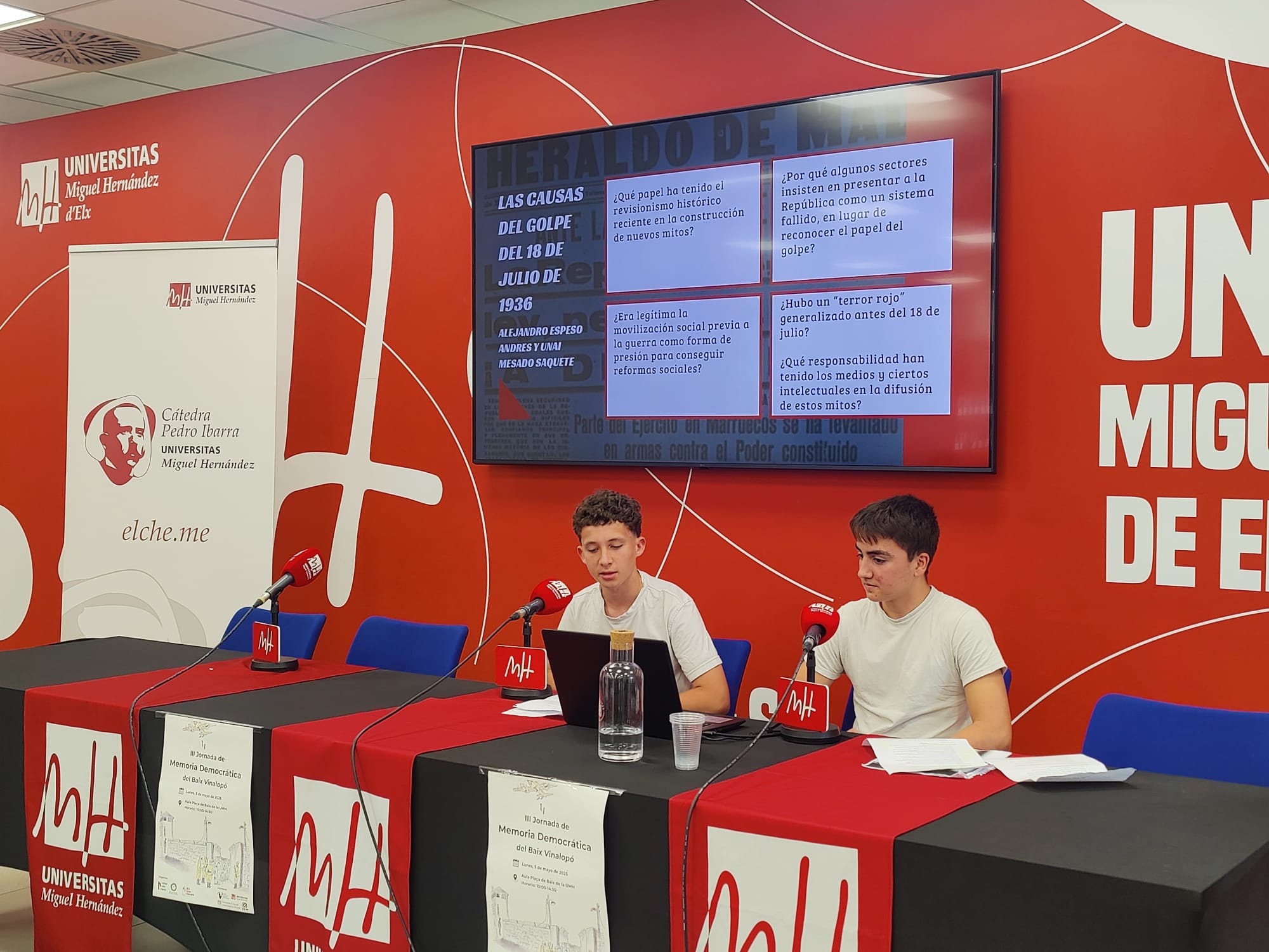 La profesora de la UA, Mónica Moreno, expuso ante el alumnado asistente sus investigaciones sobre las mujeres bajo el franquismo. Por su parte, el director de la Cátedra Pedro Ibarra de la UMH, Miguel Ors, presentó a los estudiantes de secundaria la web de la cátedra como una herramienta para conocer e investigar sobre la historia ilicitana.