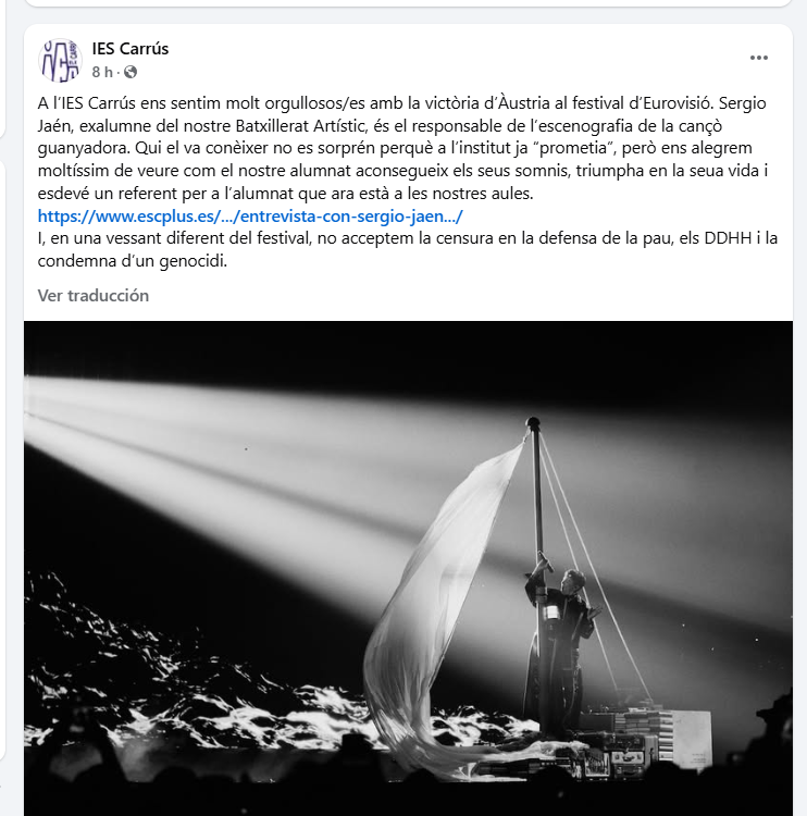 A l’IES Carrús ens sentim molt orgullosos/es amb la victòria d’Àustria al festival d’Eurovisió. Sergio Jaén, exalumne del nostre Batxillerat Artístic, és el responsable de l’escenografia de la cançò guanyadora. Qui el va conèixer no es sorprén perquè a l’institut ja “prometia”, però ens alegrem moltíssim de veure com el nostre alumnat aconsegueix els seus somnis, triumpha en la seua vida i esdevé un referent per a l’alumnat que ara està a les nostres aules.